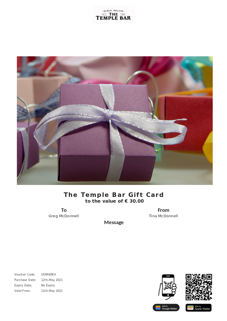 The Temple Bar allows you to purchase instantly printable gift vouchers, special offers and tickets using the Voucher Connect platform.